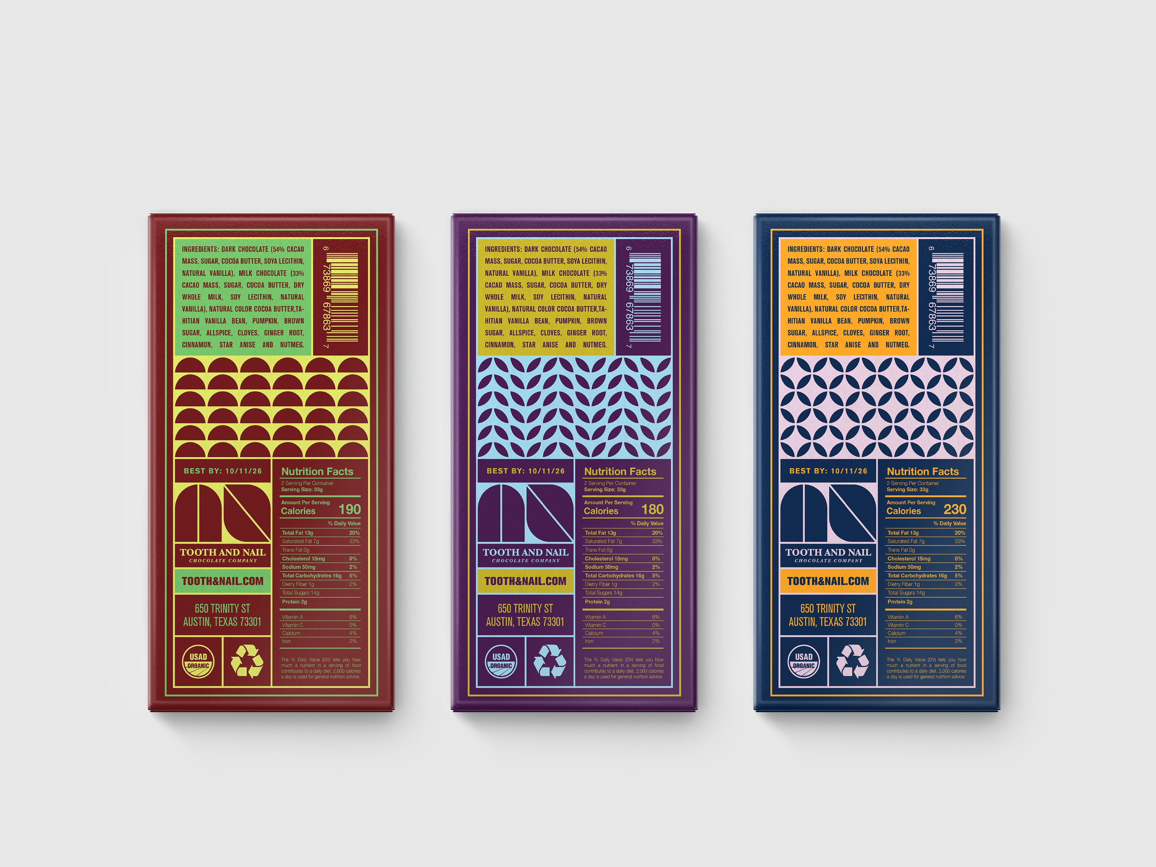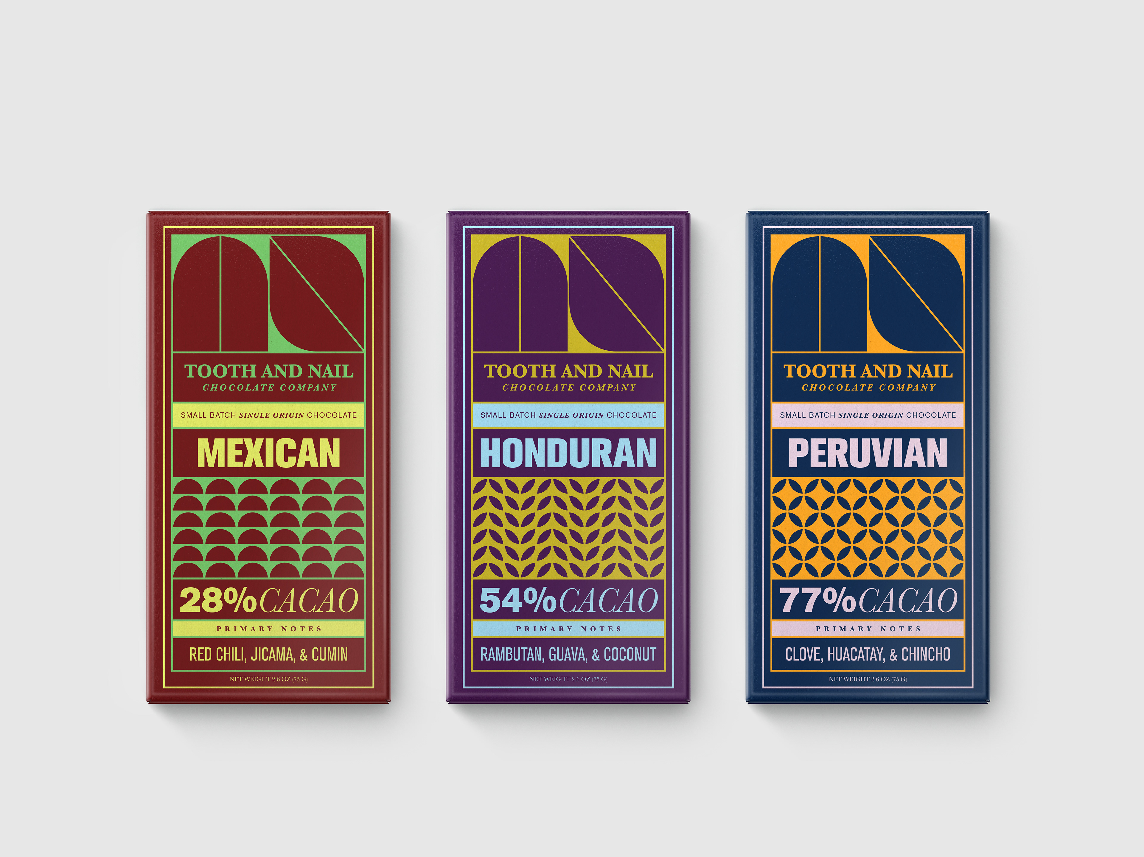 Tooth and Nail Chocolate Company crafts global specialty chocolates with vibrant, modern packaging—each flavor defined by its own elegant color palette and unique pattern.